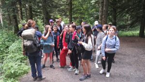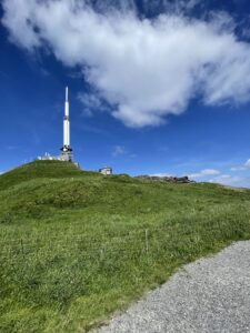 Allez, un peu de sérieux, revenons à notre premier jour. Voyage tranquille, arrivée au Puy de Dôme pour le pique-nique avec un vent bien frais. Nous avons retrouvé nos 3 guides pour partir à l’ascension de ce sommet le plus haut de la chaîne des Puys. Départ à 1070m d’altitude, arrivée à 1465m sur une distance de 2km500. Je vous laisse faire le calcul de dénivelé (et attention, la calculatrice est interdite ! Vos enfants ont fait le calcul de tête, à vous de bosser un peu !). C’était beau, très beau, très très beau !!! Et pour certains c’était dur, très dur, très très dur mais arrivés là-haut, tout était oublié ! Ca glissait sur la descente mais tout s’est bien passé. Le seul hic c’est leur difficulté à se concentrer et à être attentifs aux discours des guides. Petit rappel à l’ordre donc pour rappeler la notion de respect et que nous sommes là pour en apprendre davantage sur les volcans de façon ludique et dynamique (il fallait bien un petit point plus sérieux, vous n’allez pas que rire quand même ?!).